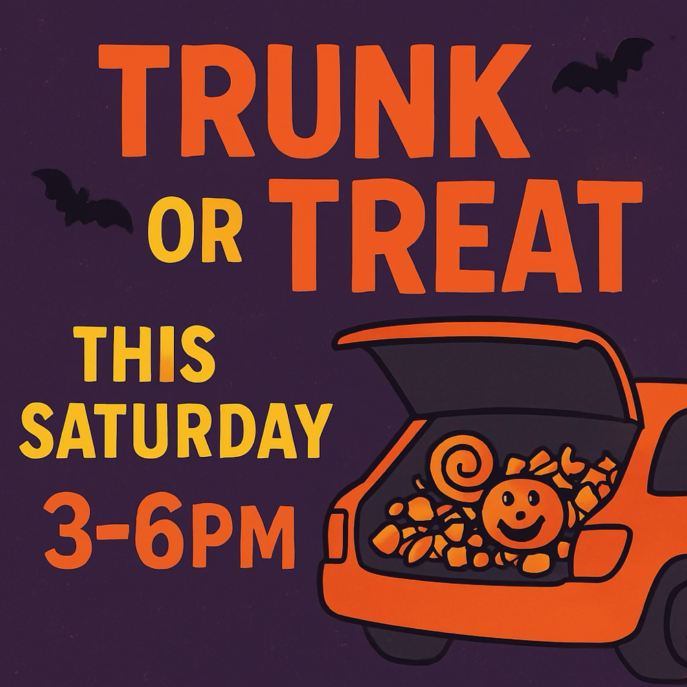 Come One, Come All to the Third Annual Trunk or Treat! Saturday October 25, 3:00-6:00pm. Decorate your cars in whimsical, non-scary motifs and hand out treats to church and neighborhood family children!